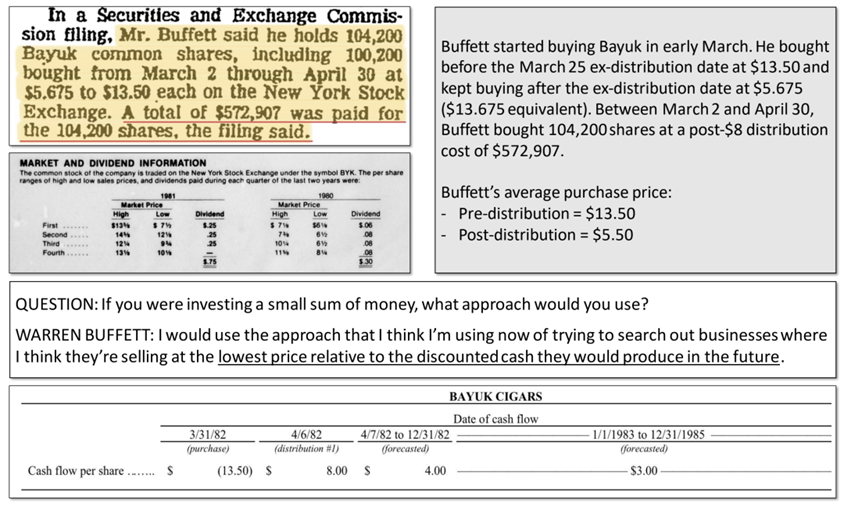 同年3月,巴菲特开始出手,在3月2日,他以13.5美元的价格买入了该公司。为什么要做花13.5美元买价值仅仅15美元的投资?因为Bayuk将在几周内支付8.00美元,在几个月内支付4.00美元。鉴于这些大笔预付款,巴菲特的购买价格相对于Bayuk预期现金流的现值来说很便宜。