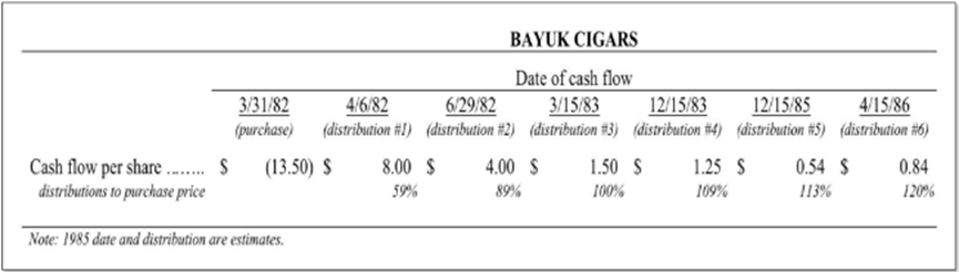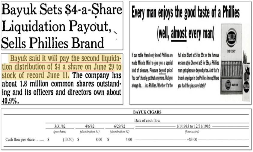 借此机会,我们一起回顾一下,巴菲特的早期经典套利操作——贝尤克雪茄公司(Bayuk Cigars Inc.)。1982年,巴菲特通过其私人账户购买了Bayuk 6%的股份。他的572,907美元投资产生了50%的IRR,而且“几乎没有风险”。