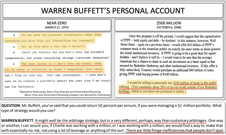 沃伦·巴菲特一生做过超过300次套利交易,他曾言:“在格雷厄姆-纽曼公司工作期间,我研究了该公司在1926年至1956年整个生命周期内的套利收益。无杠杆回报率平均每年为20%。从1956年开始,我开始运用本杰明·格雷厄姆的套利原则,先是在巴菲特合伙公司,然后在伯克希尔。虽然我没有进行过精确的计算,但我已经做了足够的工作,知道1956年至1988年的平均回报率远超20%。”